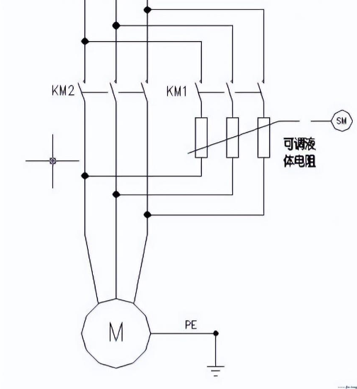 上圖是高壓水阻柜一次電路圖,M是主電機,啟動時KM1合閘, KM2分閘,啟動完成時KM2合閘,KM1分開,這個邏輯關系是靠PLC控制完成的,每臺水阻柜內都會裝一臺PLC,當然還得接合上端的高壓柜和水阻柜內的溫度、報警等其他輸入、輸出點來共同完成一個啟動過程。
